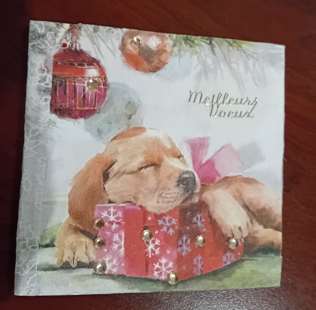 ici por la carte du chien on se sert de la technique du serviettage sur papier .